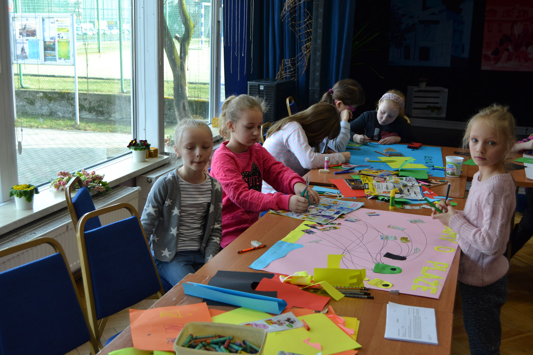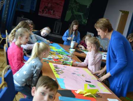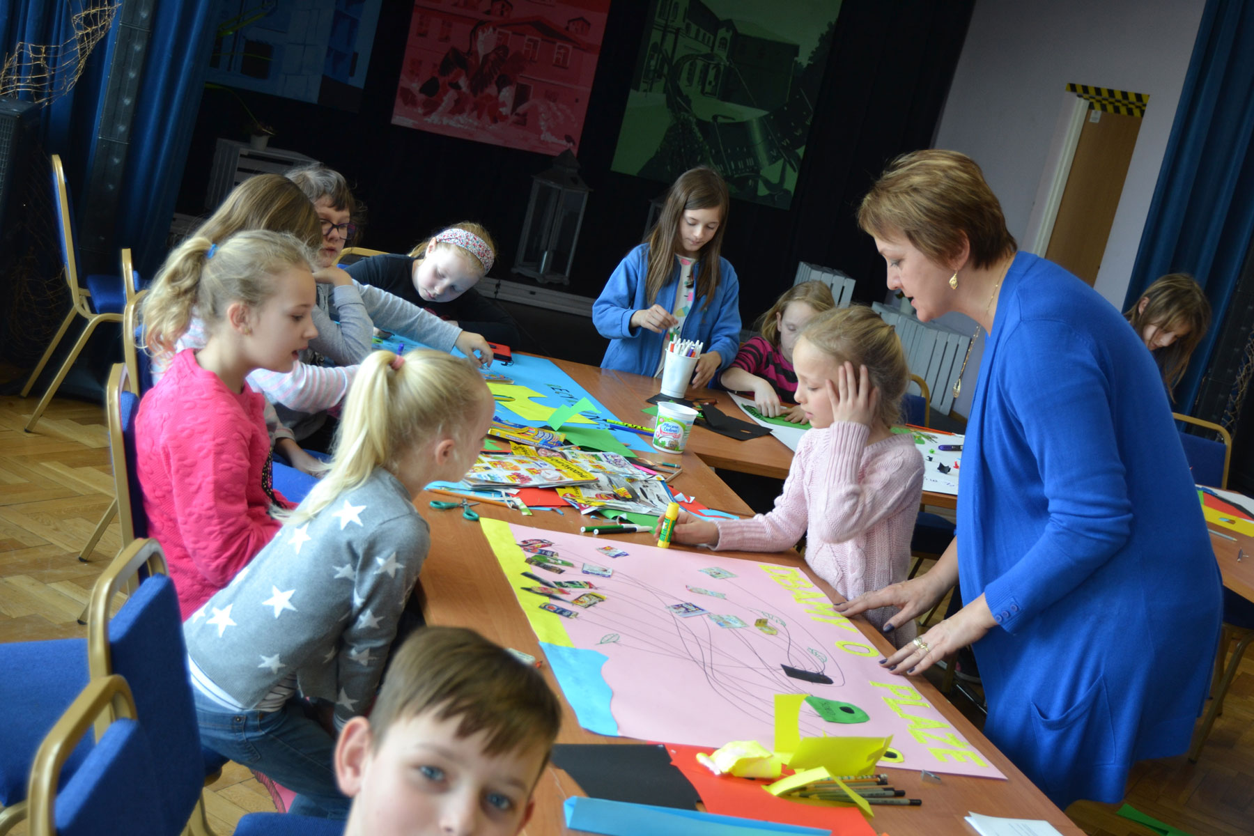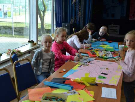 Kolejną propozycją spędzenia wolnego czasu podczas zimowych wakacji były warsztaty plastyczne tworzenia plakatu, które poprowadziła Anna Juszczak. Młodzi plastycy przygotowywali różnymi technikami prace pod hasłem „Dbamy o środowisko”. Kolorowe brystole, skrawki papieru, wycinki z gazet wypełniały całą salę widowiskową KOK.
