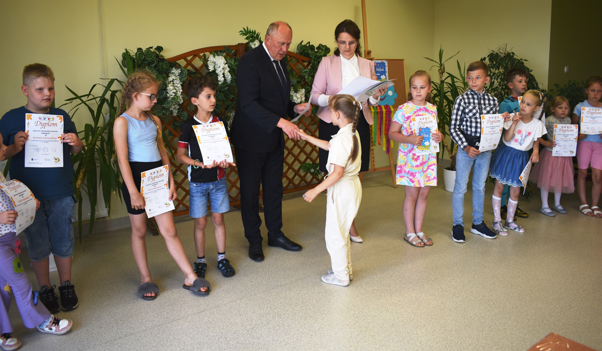 W czerwcu br. w Gminnej Bibliotece Publicznej w Trzcinicy odbyły się ostatnie kreatywne warsztaty edukacyjne. Tym razem na zajęcia dla najmłodszych zawitał wójt gminy Trzcinica Grzegorz Hadzik, który pogratulował małym uczestnikom osiągnięć, pomysłowości i zaangażowania w pracę twórczą podczas warsztatów. Ponadto wraz z dyrektor książnicy Renatą Gość wręczył dzieciom pamiątkowe dyplomy oraz słodkie upominki.